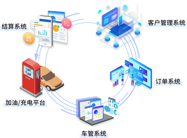 解决方案:客户管理系统+订单系统+车管系统+加油/充电平台+结算系统。