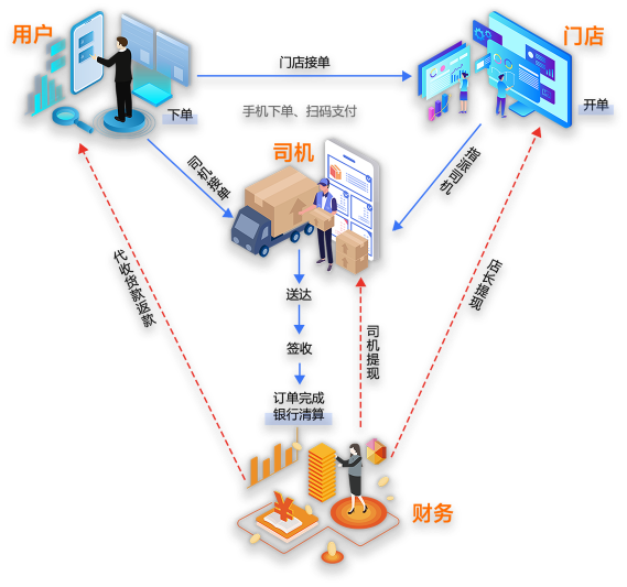 服务对象:围绕批发市场或物流园区、仓库等区域主要开展整车或拼车运输业务的同城即时配送企业,需要对会员、车辆、司机、运价、订单等进行系统化管理,满足自动计价、运单跟踪、线上支付结算清分管理、司机实时提现、报表统计分析管理等要求